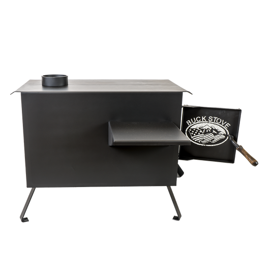 Buck Stove Model Little Buck Black Wood Burning Campstove With Legs, Shelves and 4" Collar