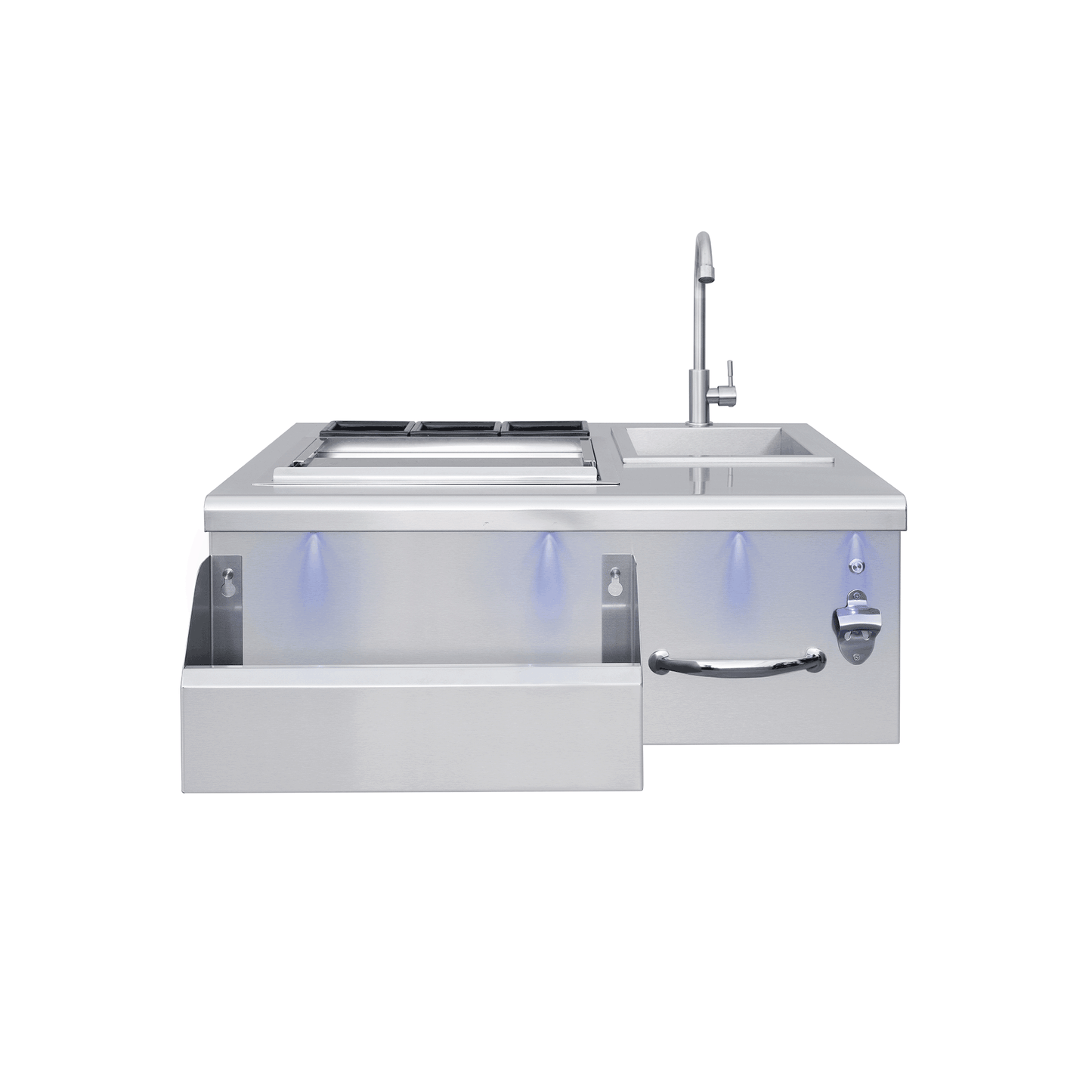 With our grills heating things up, we have just the thing to cool you down! Take your outdoor kitchen to the next level with the Summerset Grills Beverage Center. Complete with a 40 lb. ice compartment, sink, towel holder, blue front panel LED lighting, speed rail with a condiment tray, built-in bottle opener, and a Gold Standard Warranty, this will make you the best host in the neighborhood!