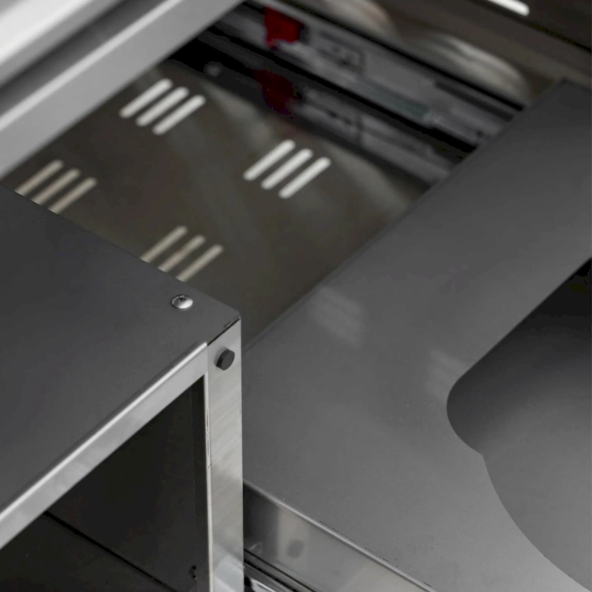 The 304 stainless steel cart includes updated handles, foldable side shelves, an interior shelf, a roll-out shelf for a propane tank, and even interior lights for improved visibility. The doors have soft-close hinges for smooth operation, and the four heavy-duty locking casters make it easier to move and help ensure it stays put.