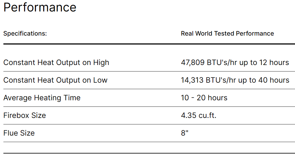 At 81% efficiency the King is the most efficient wood stove in the world. This allows you to get the most heat out of your wood to reduce your heating costs. The King has the largest and deepest firebox of any stove on the market and is for serious wood burners. This stove is great for families who live in colder climates, have larger homes or need heat for longer periods of time. You can fit up to 80 lbs. of wood into the King's 4.35 cu.ft. firebox. That's equal to 708,275 BTUs of available wood energy. The King can burn for 40+ hours on low or produce a tremendous amount of heat for 12 to 16 hours, depending on your installation and wood type.