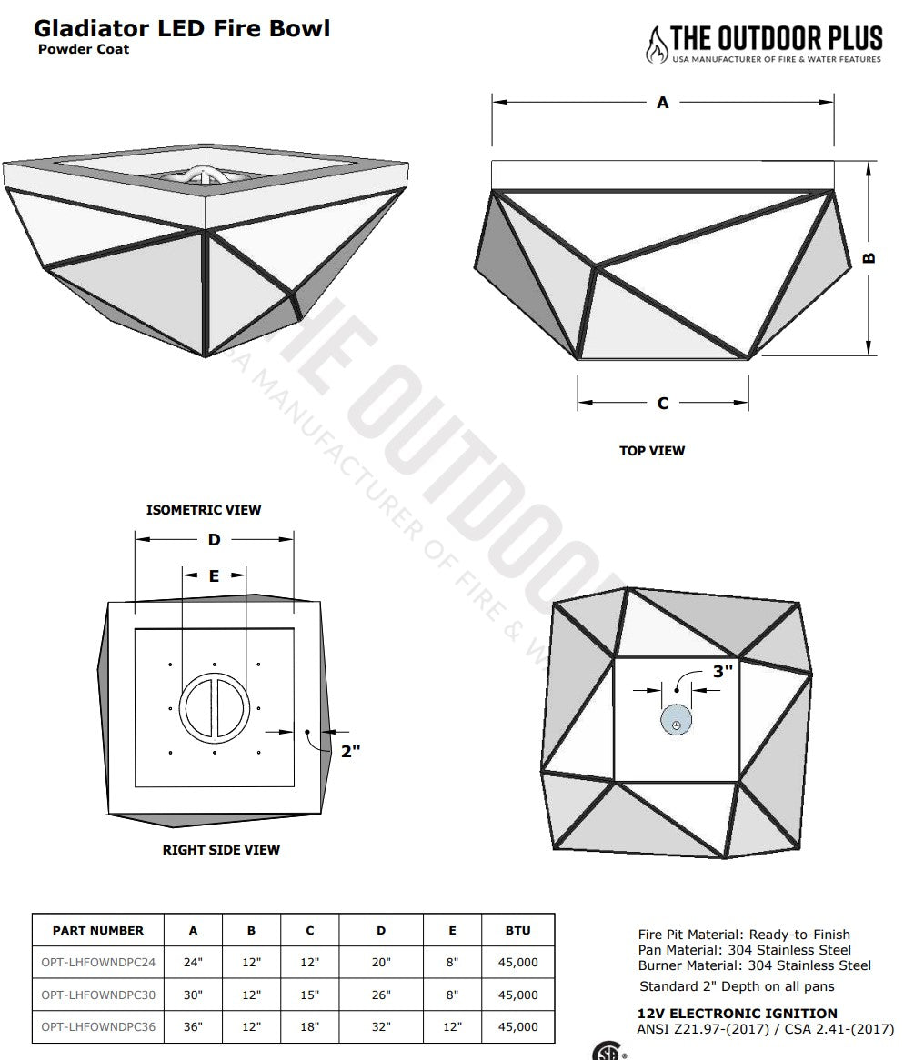 Gladiator Led Fire Bowl Metal Powder Coat by The Outdoor Plus - Free Cover Included