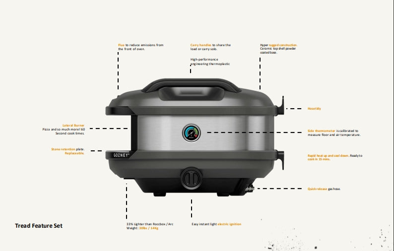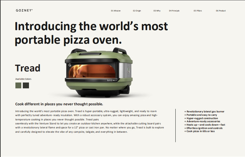 Introducing the world’s most portable pizza oven. Tread is hyper-portable, ultra-rugged, lightweight, and ready to roam with perfectly tuned adventure-ready insulation. With a robust accessory system, you can enjoy amazing pizza and high-temperature cooking in places you never thought possible. Tread pairs seamlessly with the Venture Stand to let you create an outdoor kitchen anywhere, while the attachable cutting board pairs with a revolutionary lateral flame and space for a 12” pizza or cast-iron pan. No matter where you go, Tread is built to explore and carefully designed to elevate the vibe of any campsite, tailgate, and everything in between.