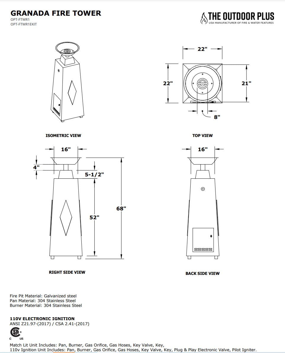 Elevate your outdoor space with the TOP Fires by The Outdoor Plus Granada Fire Tower. This stunning 68-inch tall fire tower, measuring 22x22 inches, is individually handcrafted from durable galvanized steel with a sleek powder coat finish, ensuring both style and longevity.