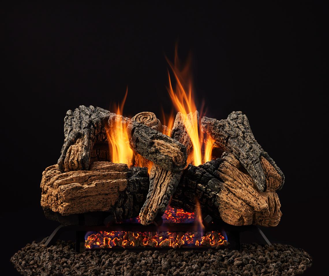 - Hand-Painted Logs - Captures a true-to-life look with the intricate details of bark, firewood grain and charring for a rustic fireside experience.