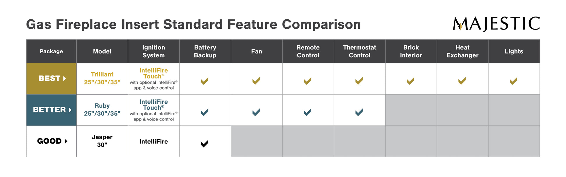 | What is Majestic's IntelliFire Technology?The IntelliFire™ Ignition System (IPI) is an advanced intermittent pilot ignition system. IntelliFire constantly monitors ignition, ensures safe functioning and conserves up to $10/month in energy costs. IntelliFire Plus (IPI Plus) takes this technology to the next level with more safety and memory settings and a programmable wireless remote control. IntelliFire Touch is the most advanced and intuitive IntelliFire system, making operating your fireplace simple, smart and safe. Select the wireless wall switch, touchscreen remote control or iOS app for the solution that fits your life. |