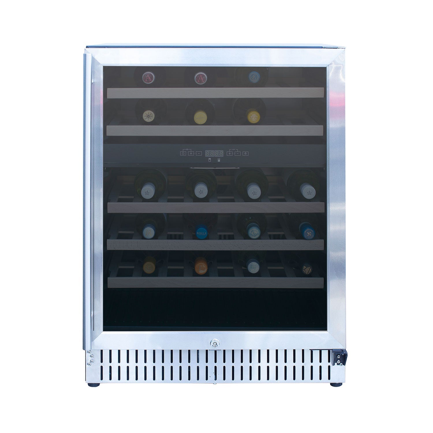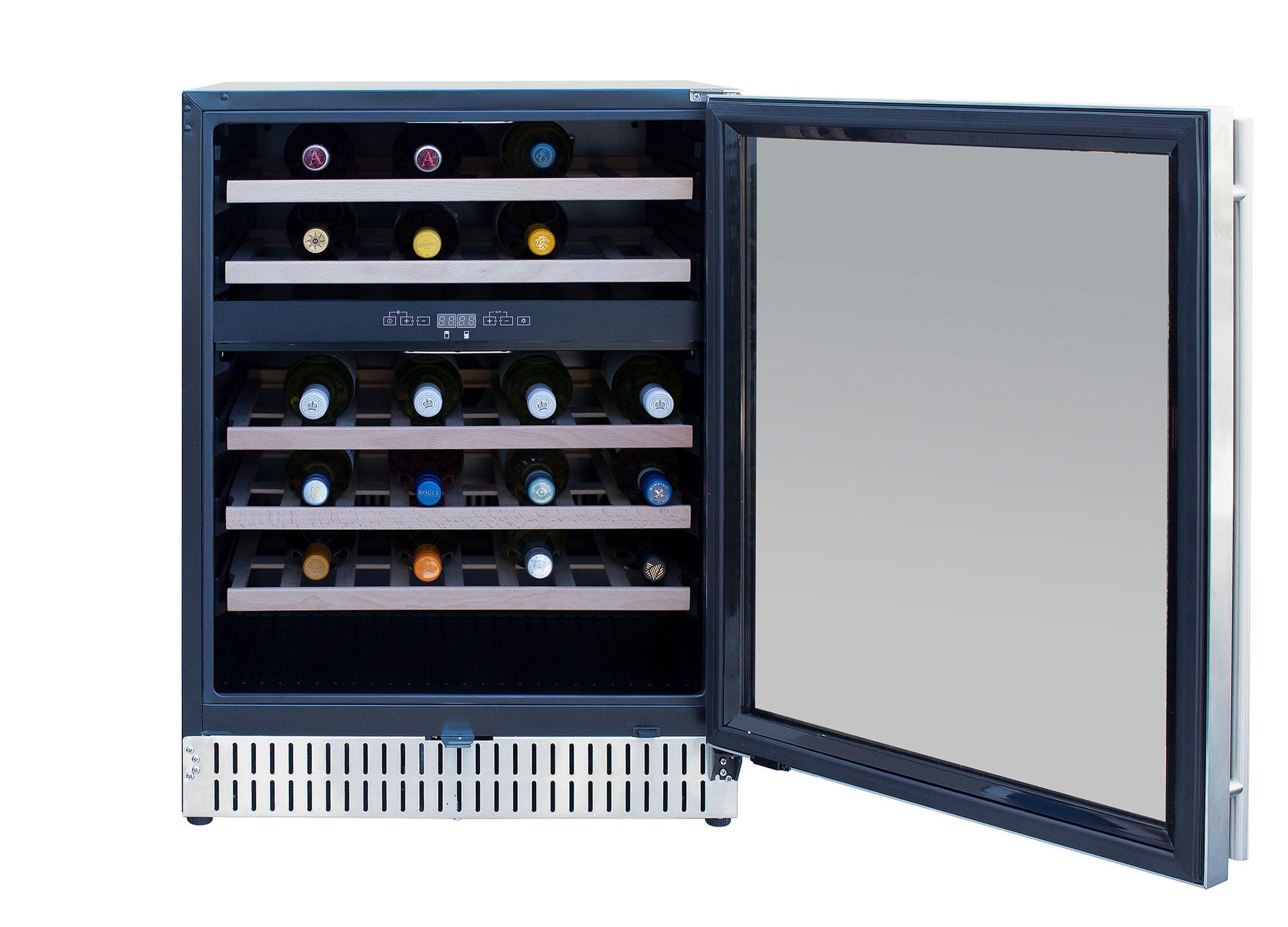 Bring modern ease and luxury to your outdoor kitchen with the Summerset Grills UL Deluxe Dual Zone Wine Cooler. Built to last and impress your guests, this wine cooler features all #304 stainless steel construction for durability, a UL-Rating for outdoor use, adjustable legs for leveling for various installations, front venting, and a Gold Standard Warranty. With a stout 5.3 cubic feet capacity, the included shelving can store up to 46 bottles in either chilled zone of your choice. The upper cabinet temperature ranges from 41-50 degrees while lower adjusts in the 50-64 degree range. Enjoy a perfect glass of wine for that breathtaking sunset or well deserved time of relaxation. The elegant tinted glass adds a high-end look to your outdoor space. The locking stainless steel door, sealed back, and temperature control keeps your cold storage energy efficient, secure from pests or children, and safe from the elements. Enjoy entertaining outdoors and always have your favorite wine at your fingertips with Summerset Grills UL Deluxe Dual Wine Cooler.