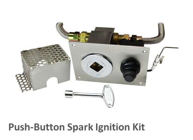 - Push-Button Spark: Activate the gas and press a button on the unit's side. Includes Push-Button Igniter Kit with Mounting Plate, Push Button Ignition, Electrical Leads, Spark Igniter, and Cover.