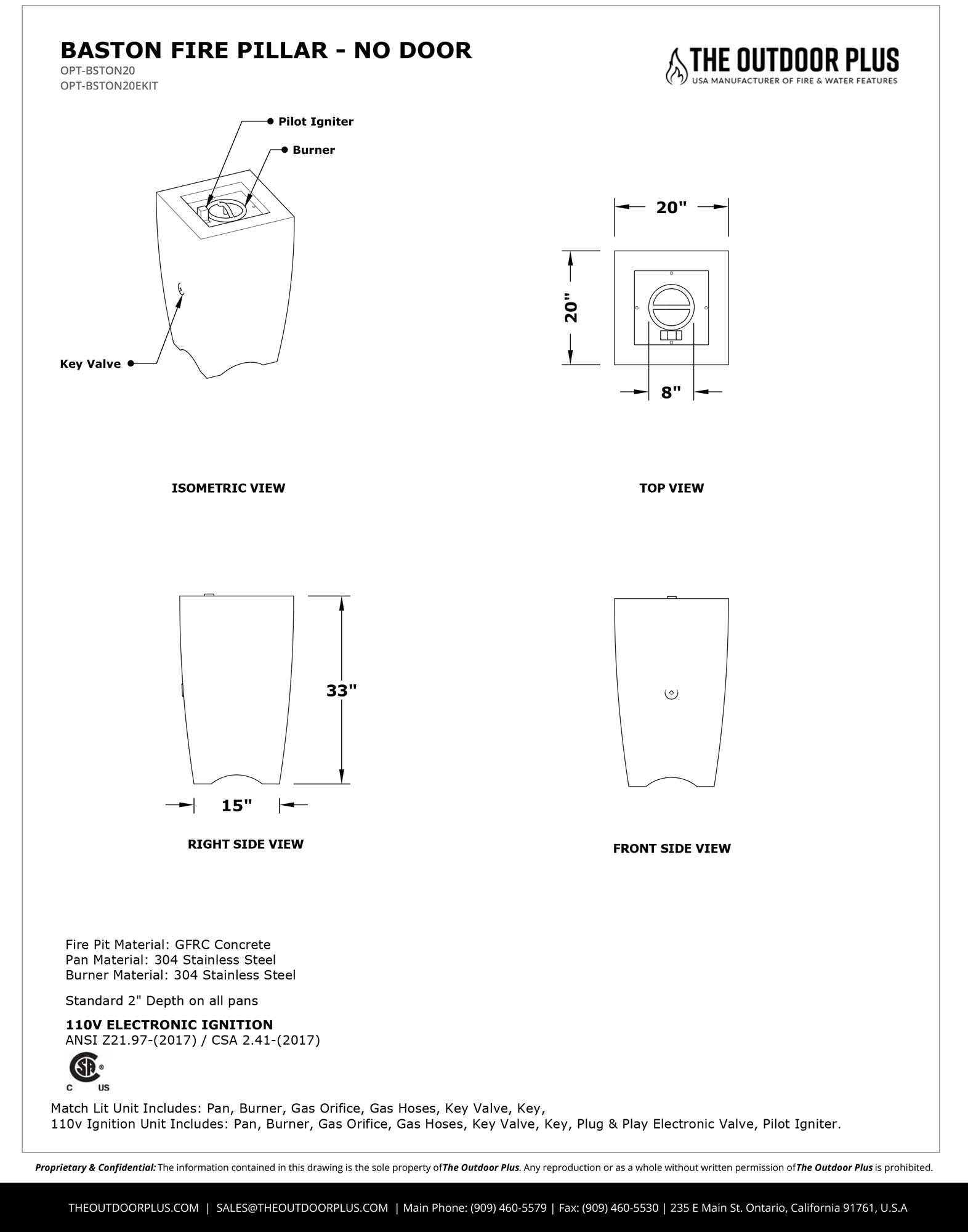- Dimensions: Upper End: 20" x 20", Base: 15" x 15", Height: 33", Burning Area: 13" x 13" x 2".