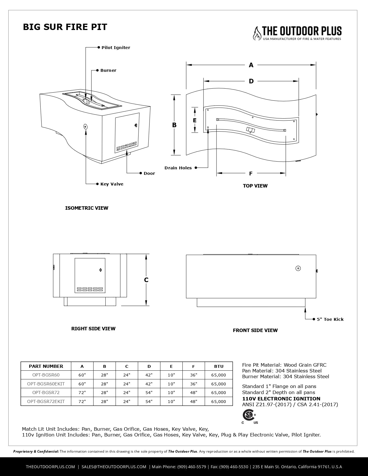 - Dimensions: Length: 60", Width: 28", Height: 24", Burning Area: 42" x 12", Toe Kick, 5" x 5".