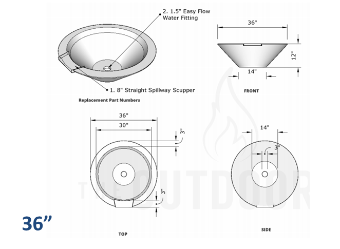 - Dimensions: Upper Diameter: 36", Base Diameter: 14", Height: 12".