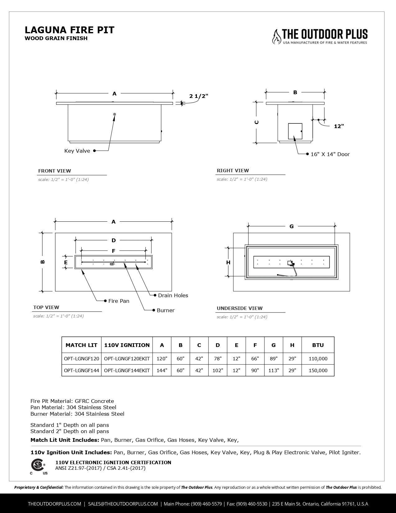 - Dimensions: Top: 120" x 60", Height: 42", Burning Area: 78" x 12" x 2", Overhang: 12".