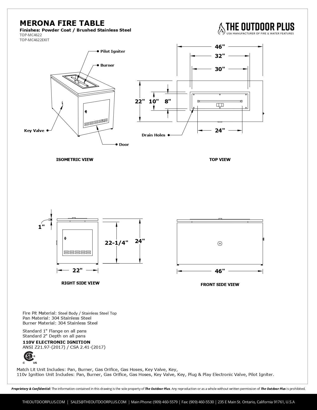 - Dimensions: Overall: 46" x 22", Height: 24", Burn Area: 30" x 8".