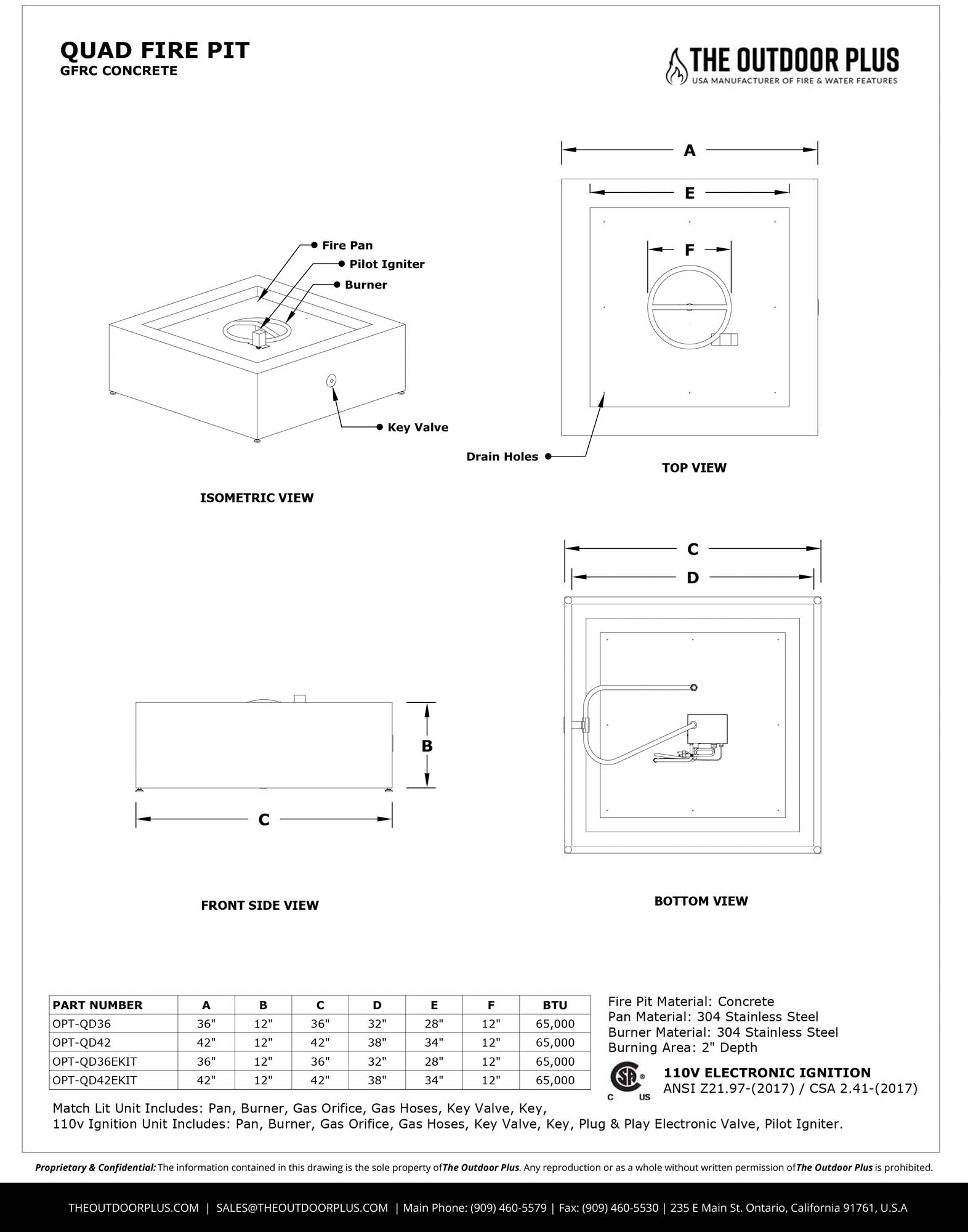 - Dimensions: Upper End: 42" x 42", Height: 12", Burning Area: 34" x 34" x 2".