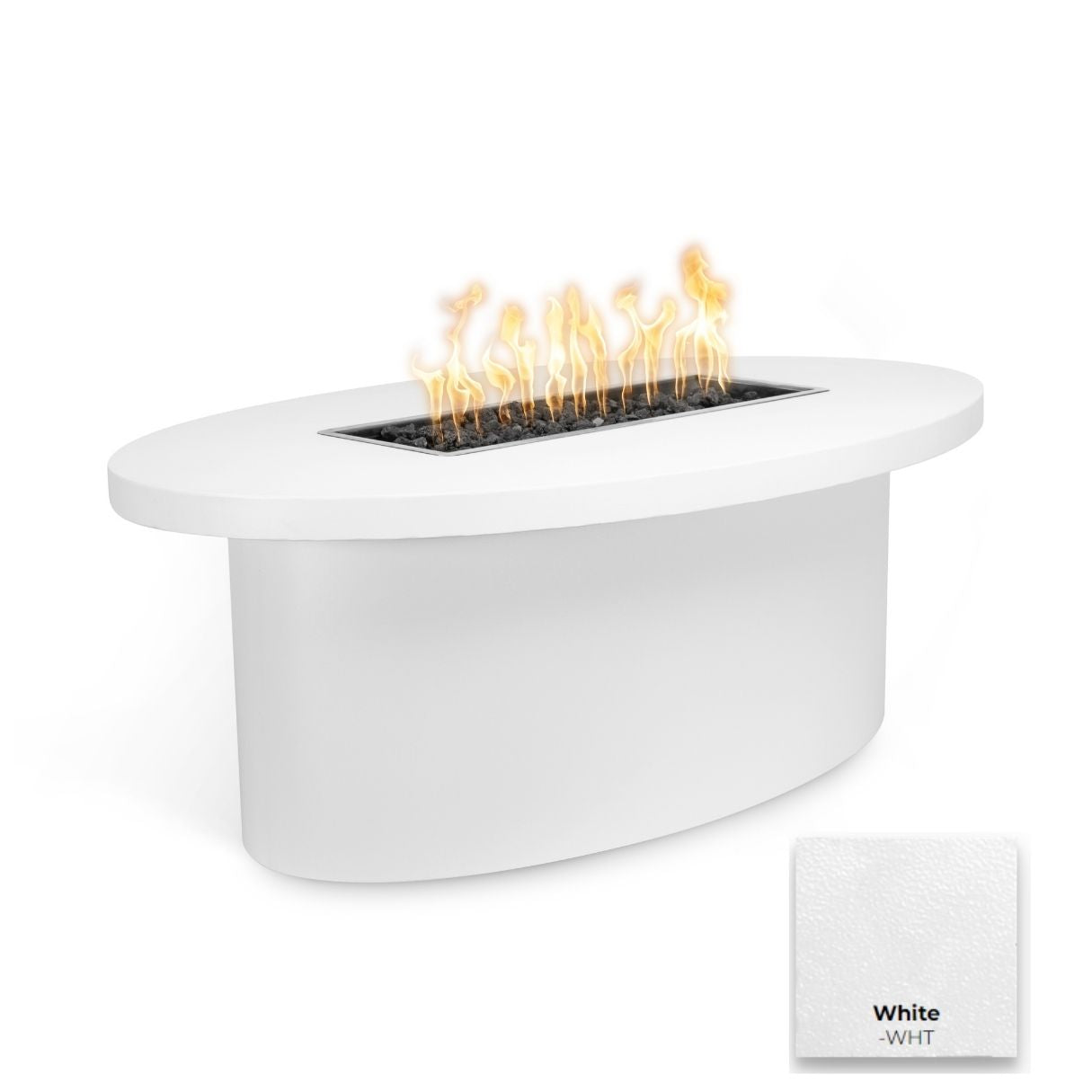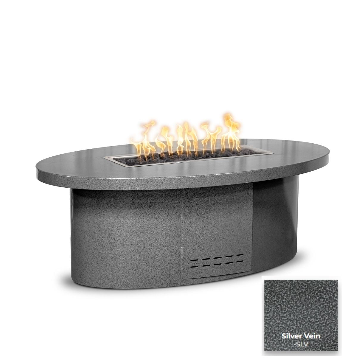 The Vallejoo Metal Fire Pit by The Outdoor Plus is a stunning oval fire table designed with the perfect height and generous tabletop overhang, making it ideal for enjoying meals on the terrace.