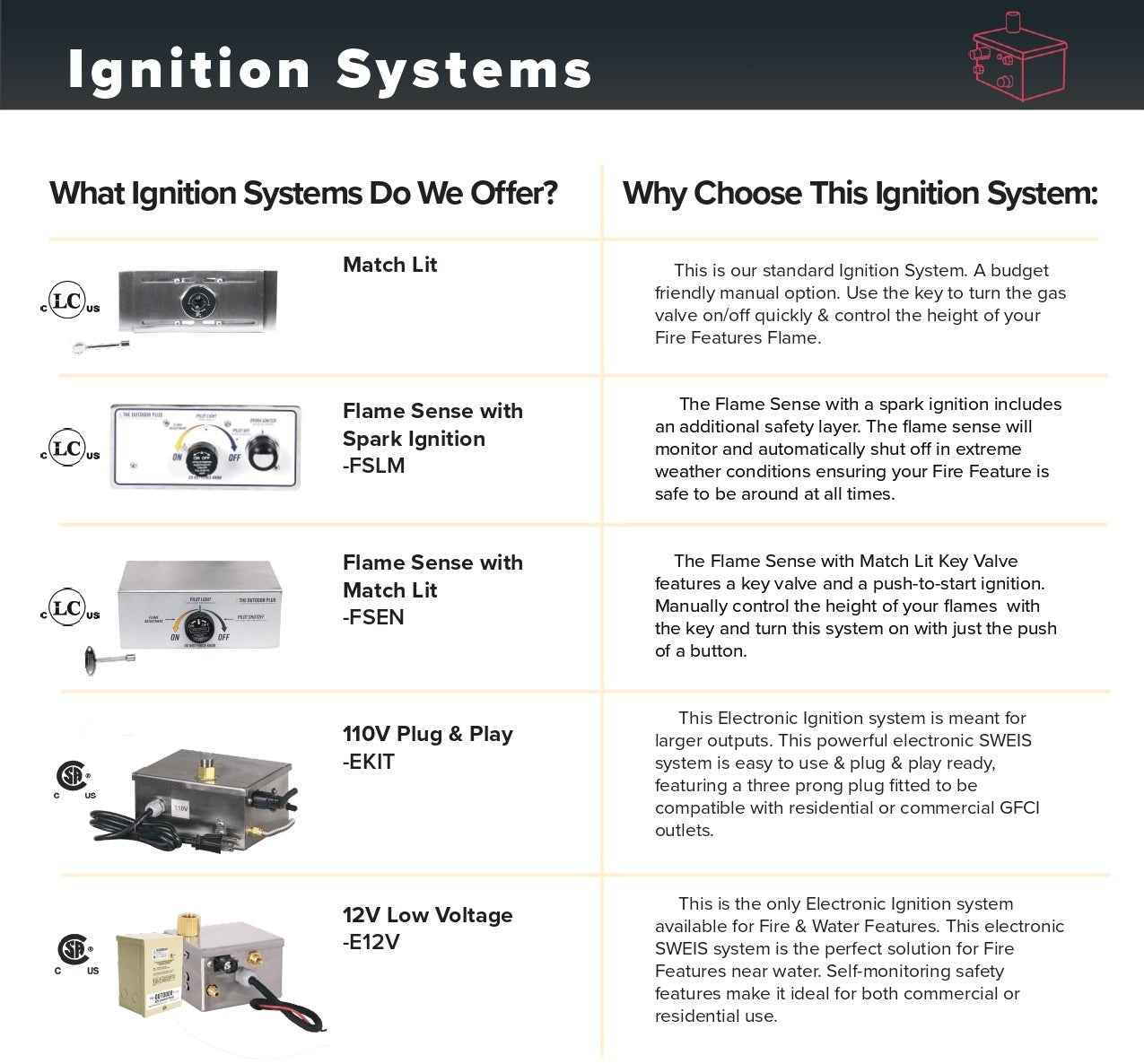 - 12V Low Voltage: The perfect choice for fire features near water, offering secure, self-monitoring safety.
