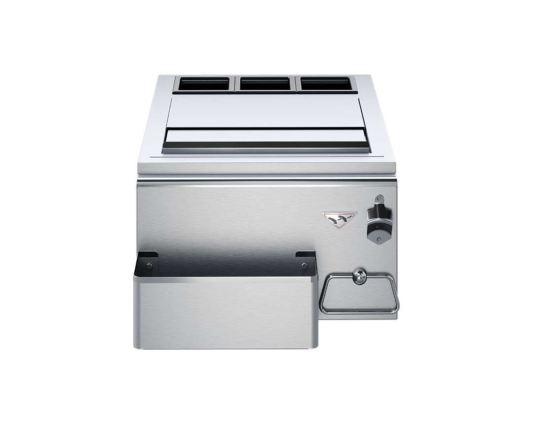 18 inch beverage center with three cooling departments, 40 lb. ice capacity, and built-in bottle opener and towel ring.